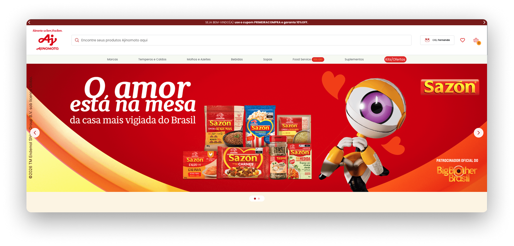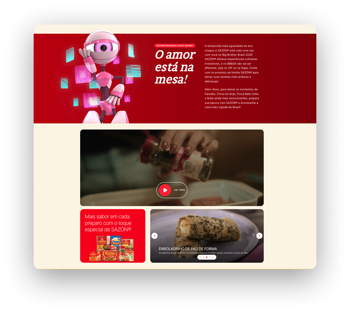 Em 2026, a Ajinomoto escolheu a Nerau para desenvolver a landing page oficial da campanha SAZÓN® no BBB, com o objetivo de apresentar toda a linha de produtos da marca aos usuários impactados pelo programa, reforçar posicionamento institucional e direcionar tráfego qualificado para a compra online.