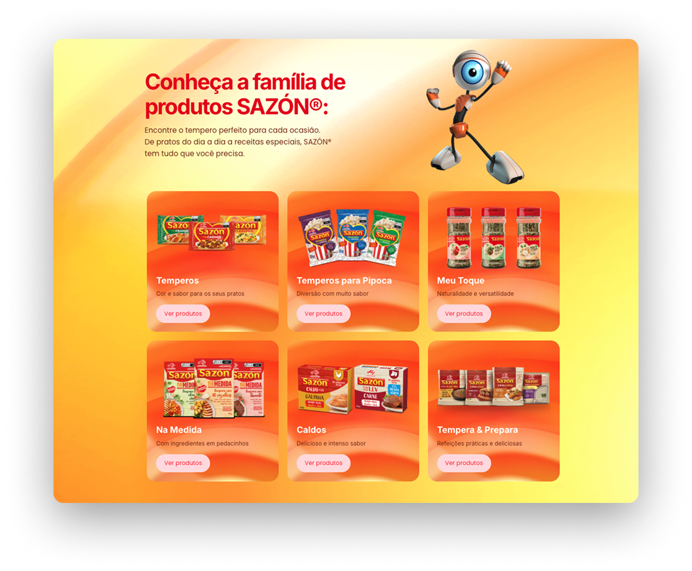A estrutura foi construída com base em fundamentos sólidos de CRO. A jornada organiza as informações de forma progressiva, primeiro reforçando a força da campanha e a conexão com o programa, depois apresentando a linha completa de produtos SAZÓN®, seus diferenciais e novidades, até conduzir naturalmente o usuário para o ambiente de compra.